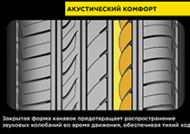 Для снижения уровня колесного шума на внешней стороне протектора имеются особые закрытые канавки, за счет которых сокращаются звуковые волны. Усиливают акустический комфорт 3-Д ламели плечевой зоны и оптимизированный дизайн плечевых блоков, которые также способствуют более равномерному распределению давления в зоне контакта. Таким образом достигается максимально тихое движение и оптимальный износ протектора.