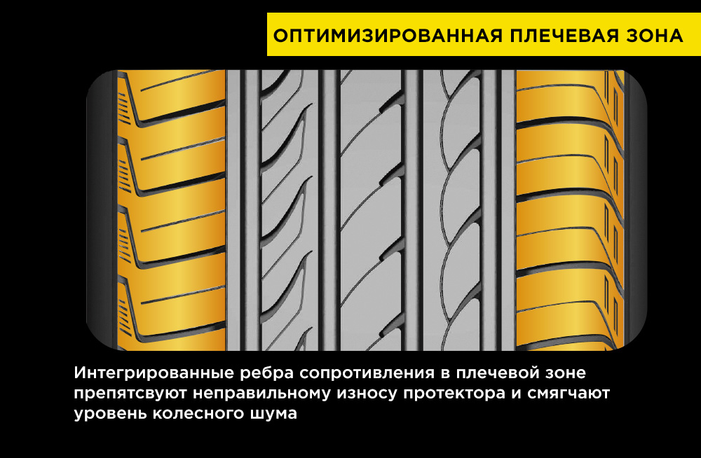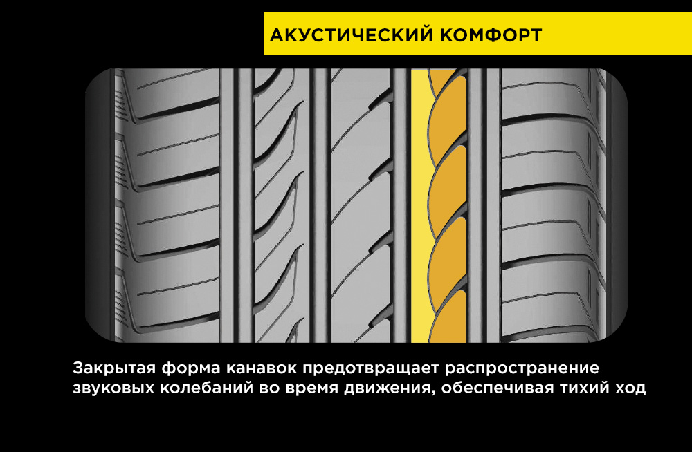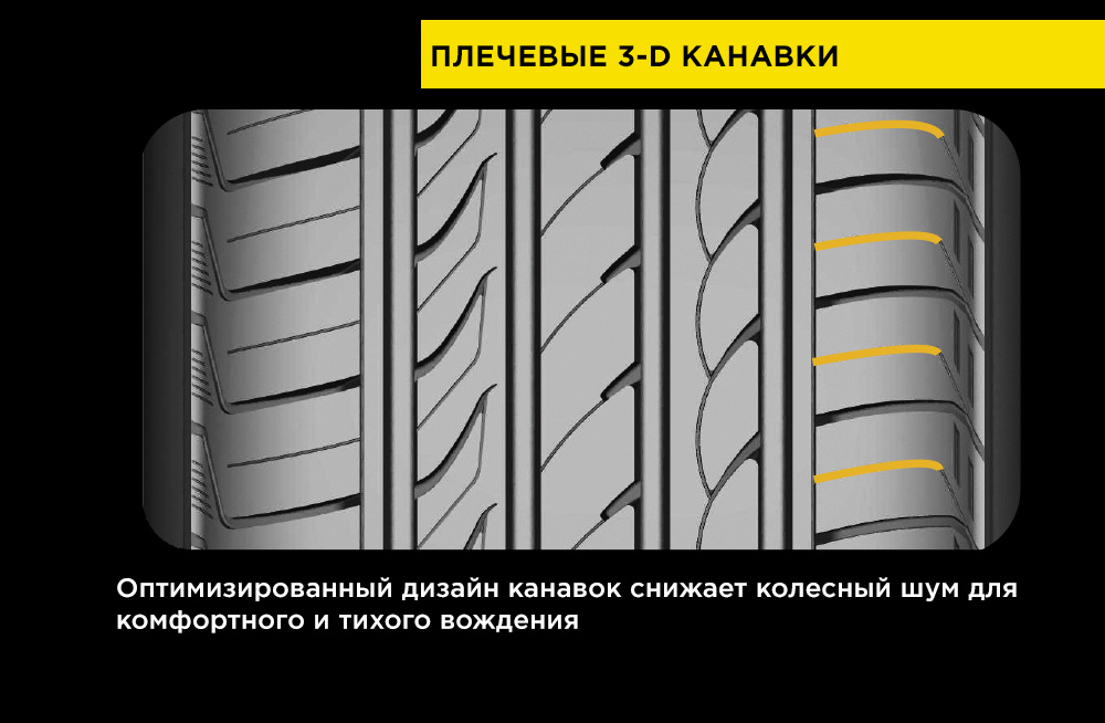 Для снижения уровня колесного шума на внешней стороне протектора имеются особые закрытые канавки, за счет которых сокращаются звуковые волны. Усиливают акустический комфорт 3-Д ламели плечевой зоны и оптимизированный дизайн плечевых блоков, которые также способствуют более равномерному распределению давления в зоне контакта. Таким образом достигается максимально тихое движение и оптимальный износ протектора.